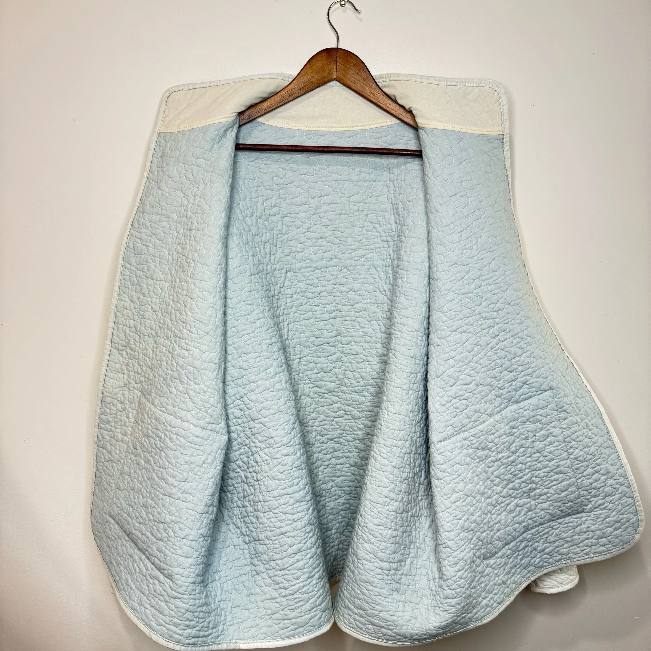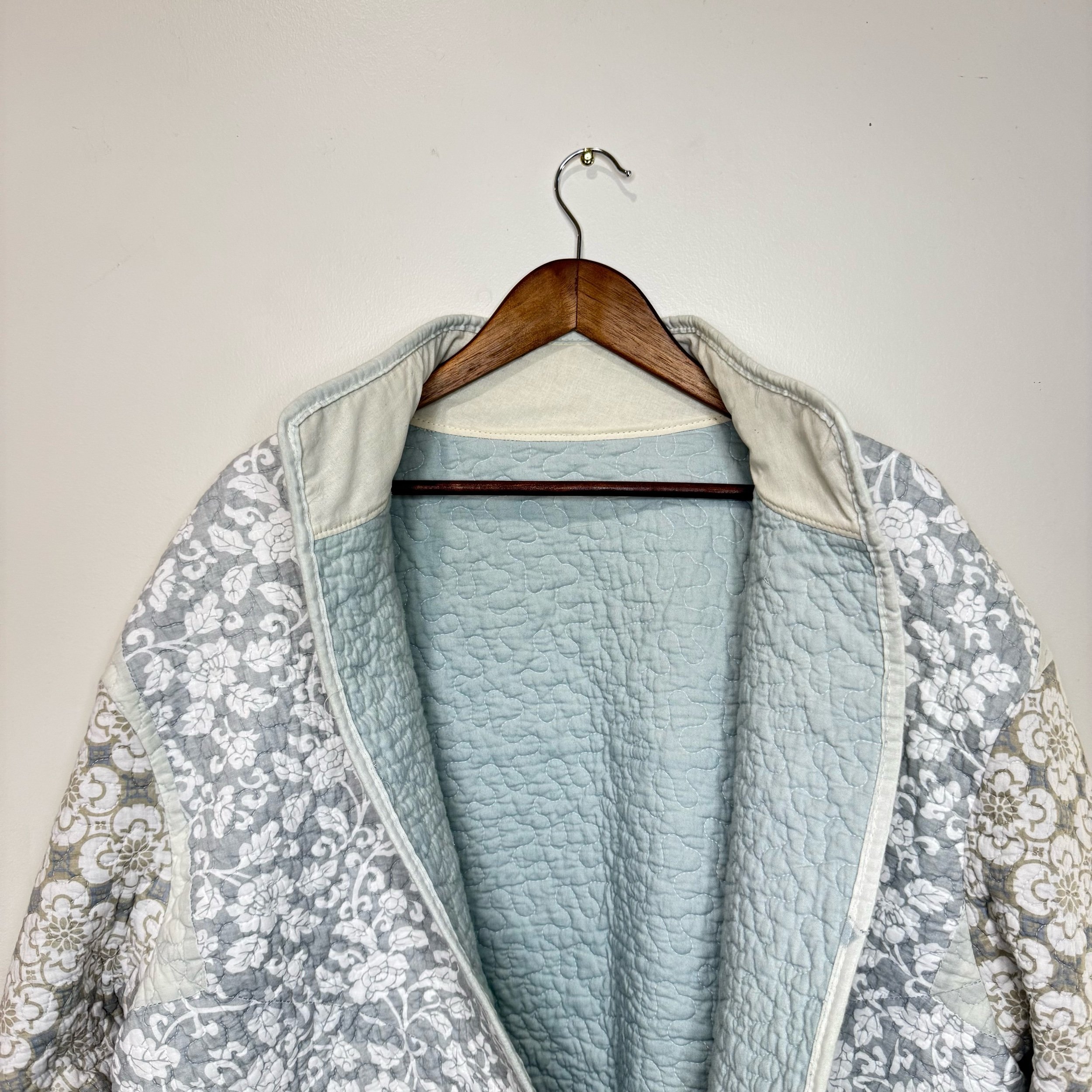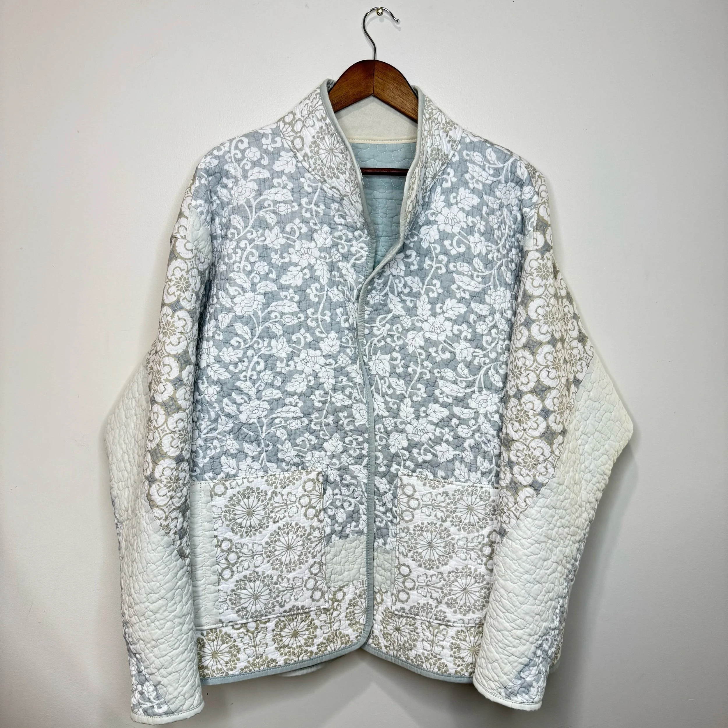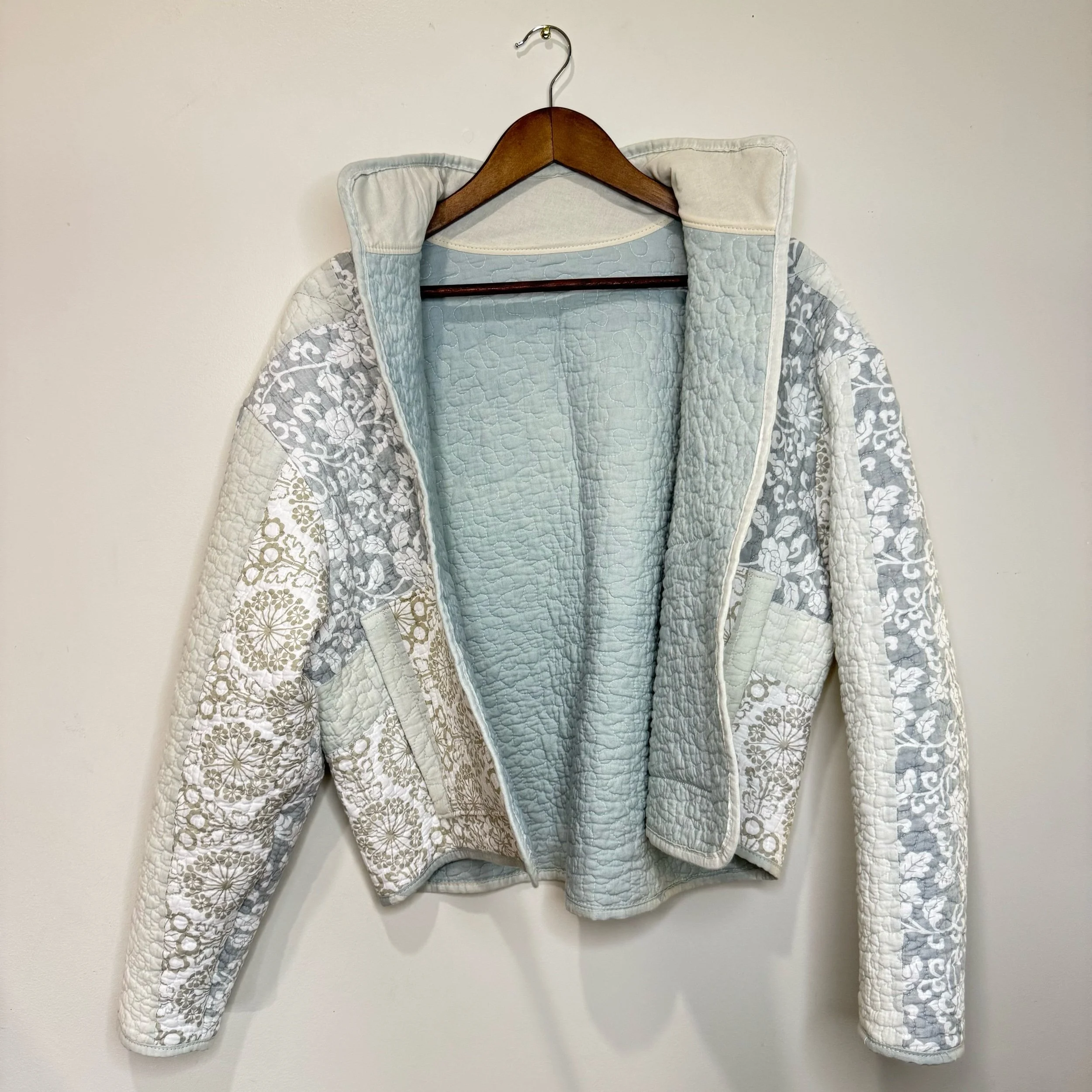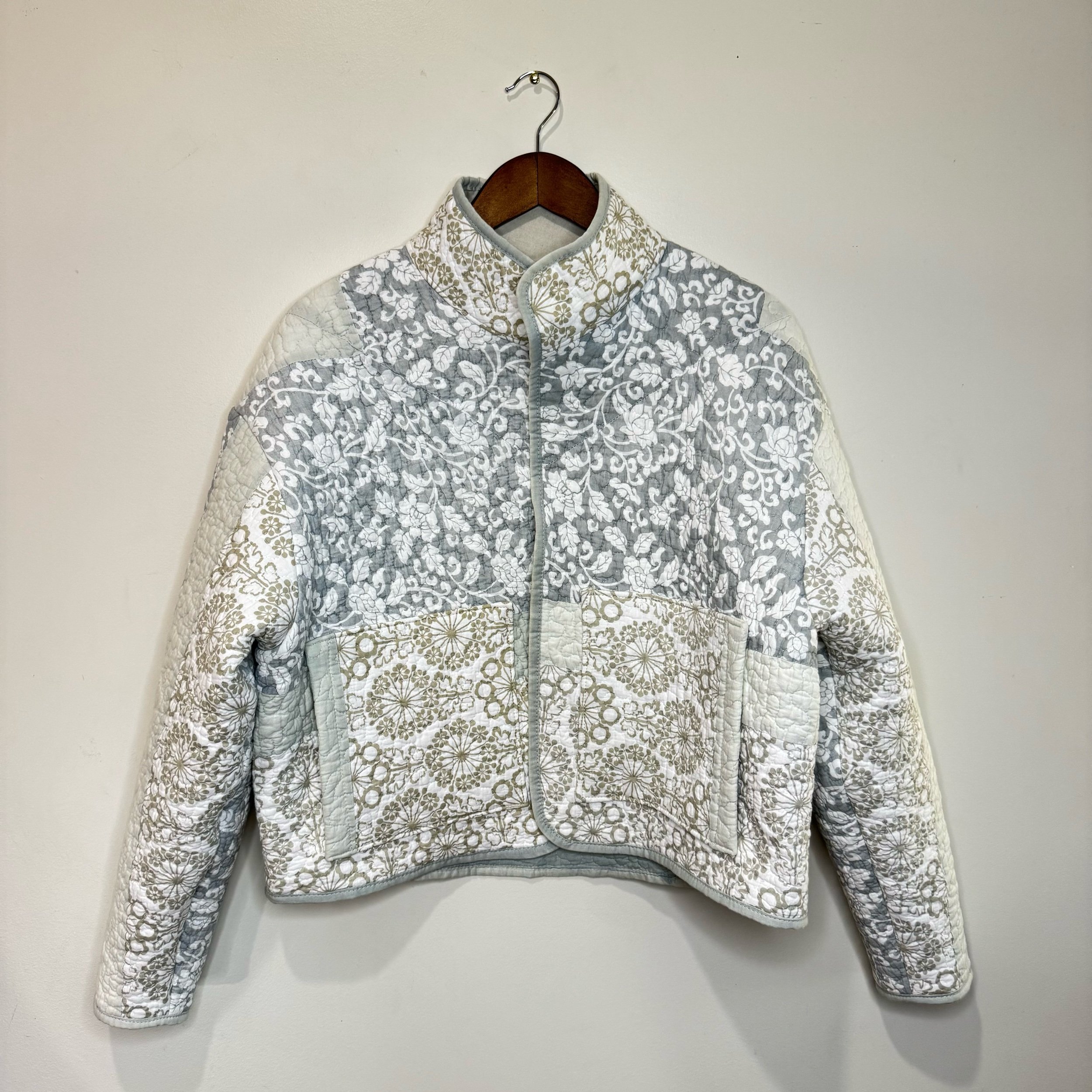 Crafted with care, this quilt jacket features two front pockets with convenient side entries, perfect for keeping your essentials close at hand. The jacket was created from a reclaimed quilt flip, adding a unique and sustainable touch to each piece. A classic collar and carefully applied binding complete the design, ensuring a complete finish. Durable, comfortable, and thoughtfully constructed, this jacket blends style with an eco-conscious ethos.